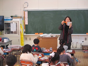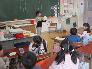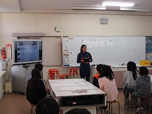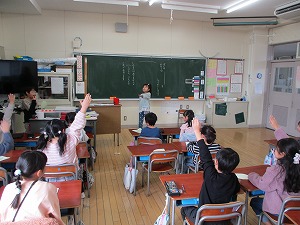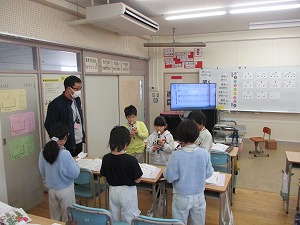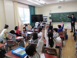 1年生では縄跳びをリズムよく回す基礎的な運動から始めました。右8回左8回右4回左4回という風に回数を重ねながら10分間縄と触れ合いました。大縄跳びでは「自分のタイミングで入って」と子どもたちの「跳びたい」という気持ちを大切に自分で判断することの大切さを教えていただきました。「できる」「できない」がはっきりする体育ですが、優しい声かけのもと、豊富な運動量で子どもたちも満足そうでした。いい体験をすることできました。ありがとうございました。