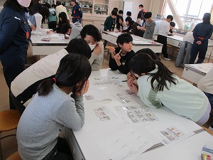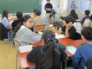 社会では公共交通について学習していました。「もし市バスがなかったら」便利である市バスを利用している人も多くいます。駅前に住む人が増えて郊外には人がいなくなります。改めて市バスがあることが便利であると再認識したようでした。