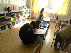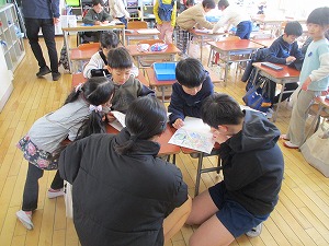 摂陽小学校では、1年生の掃除時間に6年生が掃除を手伝ってくれる慣習があります。掃除が終わった後に、らくがき帳で遊ぶ姿が見られました。1年生と6年生がかかわる姿に癒されている先生たち。素敵な時間でした。