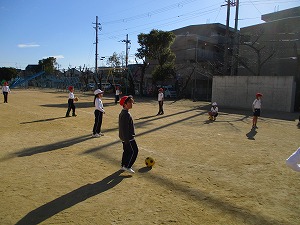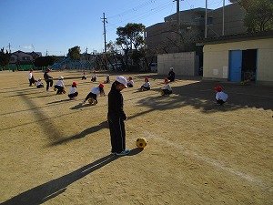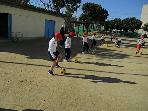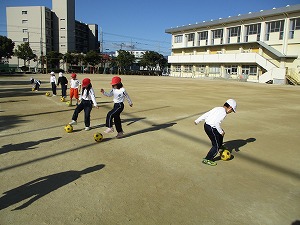 冷え込む朝でしたが「寒さに負けず」運動場でサッカーをしていました。写真はボールタッチの様子です。友だちのいいところを見つけ、良さをいかしながら上達していました。パスを出す前には〇〇ちゃんと名前を呼び、パスをすることができました。
