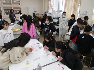 大きな地震の後には、電気・水道・ガスも止まります。多くの人が学校に避難し、避難所の設営が必要になってきます。「ワンちゃんと一緒に避難するには」「熱があがってきています。」「炊き出しはどこでしたらいいですか。」などの事例を当事者(運営者)として意識をもち、主体的に考える時間となりました。