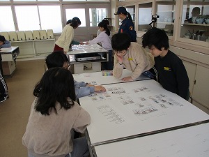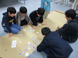 今日は5年生に避難者の年齢、性別、国籍などそれぞれが抱える事情が書かれたカードを、避難所の体育館や教室に見立てた平面図にどれだけ適切に配置できるのか、また避難所で起こる様々な出来事にどう対 応していくかを疑似体験するゲームを行いました。