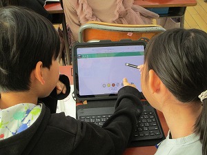 お金の計算をpadを使ってしました。1円玉5円玉10円玉を使い「36円」を表す時間です。何通りもやり方があり、楽しみながら学習することができました。
