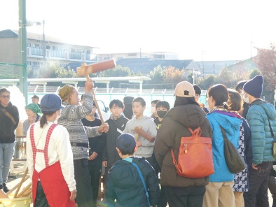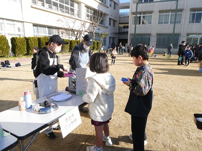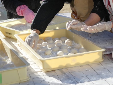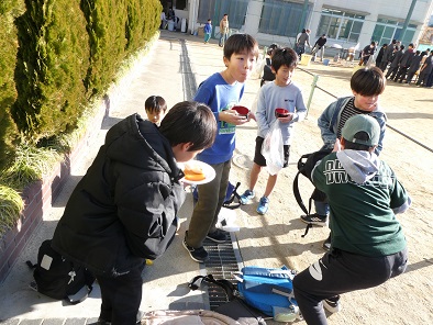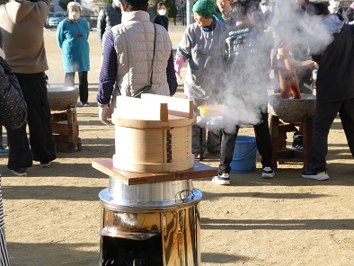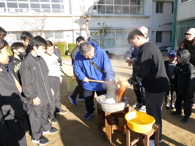 雨の天気予報はどこへ行ったのか、とてもぽかぽか陽気の中、もちつき大会を開催することができました。前日からもち米の仕込みが行われ、今朝も早くから係の皆さんが準備をしてくださいました。荒牧中学校の男子バレーボール部の生徒たちもお手伝いに来てくれて、70キロのもち米はあっという間に美味しいおもちに変わっていきました。もちつき体験も試食も行列ができ、「おいしい!」とおかわりする子もたくさん見られました。
