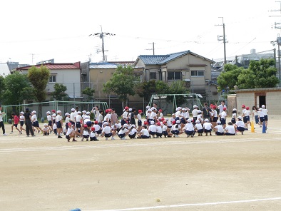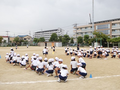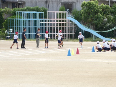 2年生は折り返しリレーの練習をしていました。1年生のリレーと大きく違うところは、バトンを後ろからもらうこと。この経験は来年3年生になったとき、トラックリレーで活かされます。「がんばれ!がんばれ!」とクラスの仲間を応援する声がたくさん聞こえました。