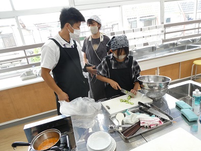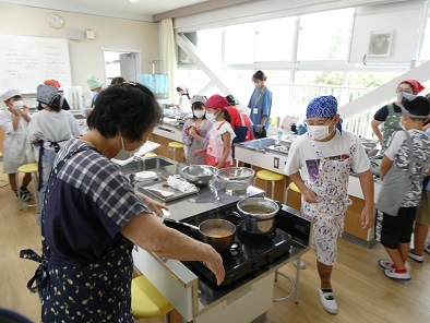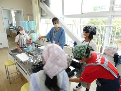 今週、初めて包丁を使う調理実習に取り組んでいる5年生です。野菜を切ってゆでて、ポテトサラダを作ります。保護者や地域の方たちの中から、たくさんのボランティアが来てサポートをしてくださっています。お料理の大先輩たちに、調理と片付けを並行させることや、火元から目を離さないことなど、たくさん教わることができました。