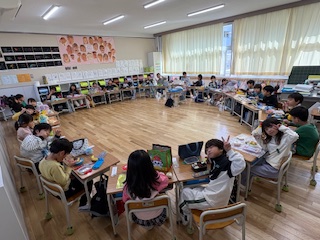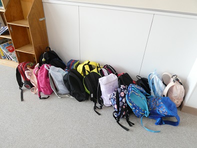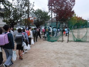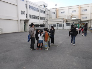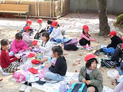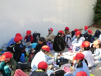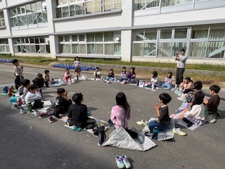今日は本当は遠足を予定していた1年生ですが、17日(月曜)に延期になりました。子どもたちはちょっと残念そうでしたが、嬉しいことも。それは「お弁当が2回食べられる」ということです。教室や中庭で円になって、おうちの人が作ってくれたお弁当をおいしくいただきました。