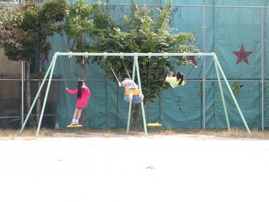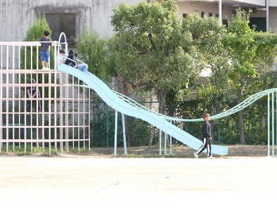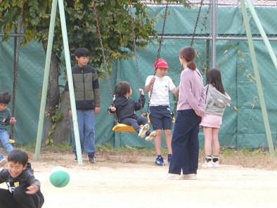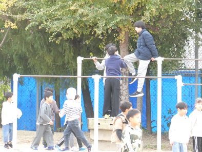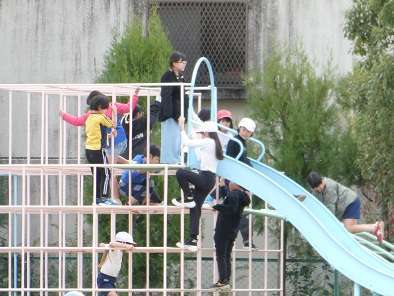 給食を食べてからの昼休み、少しだけでも遊びたい子どもたちが運動場へ出てきます。遊具なども使い放題です。