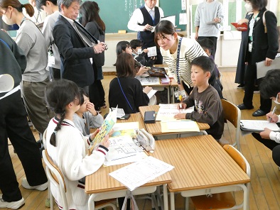 今日は3年3組が授業公開を行いました。1年生が読書好きになるように、おすすめの本を選ぶことが目標です。子どもたちの選りすぐりの本がズラリと並びましたが、それぞれのおすすめポイントを紹介しながら、グループ代表の本を決めていきます。自分の主張と相手の意見を聞きながら、司会を中心に話し合いをすすめました。事後研究会では、大阪大谷大学・今宮教授をお招きして、次期学習指導要領の傾向も踏まえながら指導助言をいただきました。