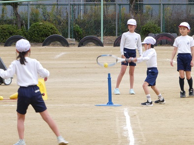 高学年のベースボールゲームに向けて、3年生ではバッティングや野球っぽさのあるルールでのゲームに取り組んでいます。初めての子も多いので、バットとラケットを選んで、ティーバッティングからスタートです。守備側はボールを取ったら、メンバーがひとかたまりに集まります。