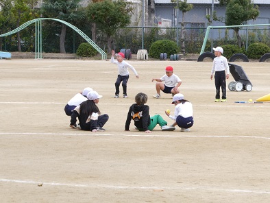 バッターは、バットで打つのではなく、ボールを投げるという、2年生にぴったりのゲームを教えてもらいました。