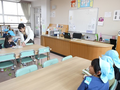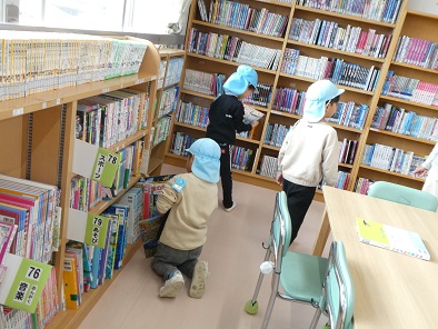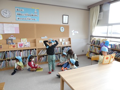 今日は荻野保育所の子どもたちが来校し、図書室で過ごしました。自分の興味のある本を選んでじっくり読んだり、先生に読んでもらったりしました。走ったり騒いだりすることもなく、図書室での過ごし方も花丸でした。