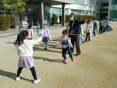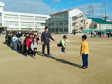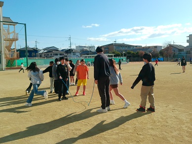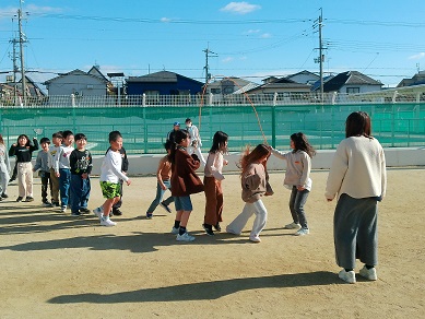 今日のなかよしタイムは、全校生が運動場に出て長縄の練習です。練習中はずっと、学校放送で楽しい音楽もかかっています。低学年は跳べる子が練習するたびに増え、高学年は8の字の記録更新に励んでいます。