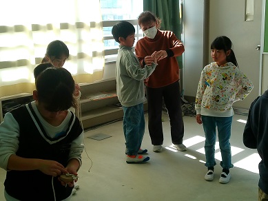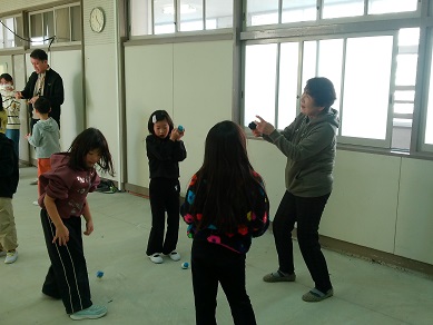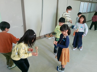 今日は地域のボランティアの皆さんをお招きして、「昔の遊び」について体験する授業を行いました。けん玉は経験のある子がいるようですが、それ以外のお手玉やこま回し、羽根つきなどはなかなか機会がないかもしれません。どうすればうまくいくか、コツを教えてもらいながら楽しみました。