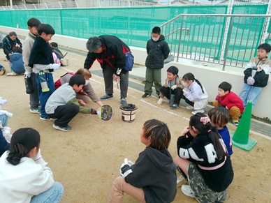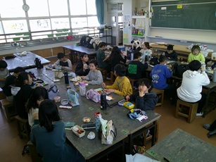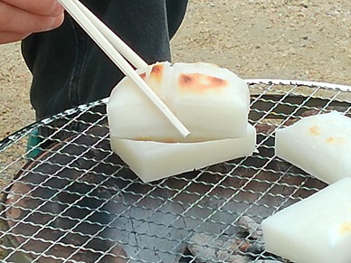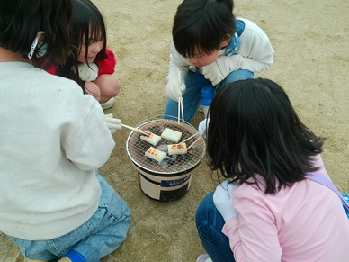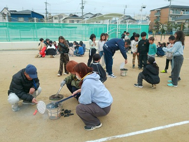 午後は運動場で3年生が七輪体験をしました。おうちの台所事情によっては、本物の火を間近で見ることも珍しい子もいるかもしれません。地域の方や保護者の方がたくさんサポートしてくださり、炭火の点火からおもちを焼くまで、無事に行うことができました。昔の暮らしについての貴重なお話もたくさん聞くことができました。