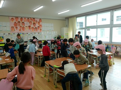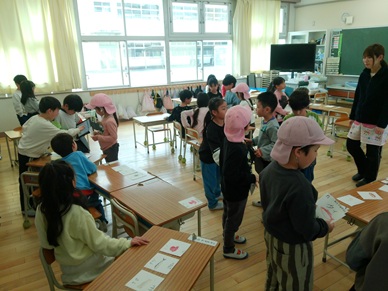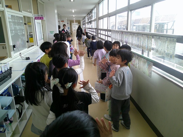 昨日の雨は無事に止みました。今日は2校時に長尾保育所の年長さんの子どもたちが学校へ遊びに来てくれました。1年生の各クラスに分かれ、一緒に遊ぶなど楽しい時間を過ごすことができました。1年生の子どもたちにとっても、「誰かのために!」と頑張れる貴重な機会です。