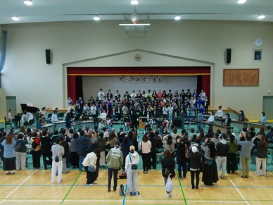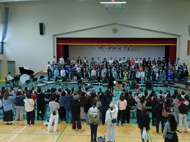 今日と来週の金曜日に分け、今年度最後の授業参観を行います。今日は2年生・5年生・6年生の授業参観が行われました。2年生は自分の名前の由来や、今年度でできるようになったこと、5年生は、1年の振り返りと最高学年に向けての決意を発表しました。6年生は保護者と一緒にチェッコリ玉入れを楽しんでから、ずっと練習してきた歌と合奏を披露しました。
