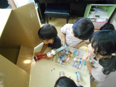 5歳児は七夕が終わってからも光への興味が広がり、プリンカップに色を塗ったり重ね合わせて光を当てることで色の変化に気づいたり、友達を誘い合い懐中電灯を当てて自分達の影を映したりしてワクワクしながら遊ぶ子ども達の姿がありました。