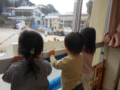 先日から園庭で配管工事をしています。園庭で遊ぶことはできませんが、子ども達は楽しみを見つけました。
