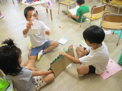 「もういいか~い」「もういいよ~」カマキリのペープサートを作り遊んでいます。