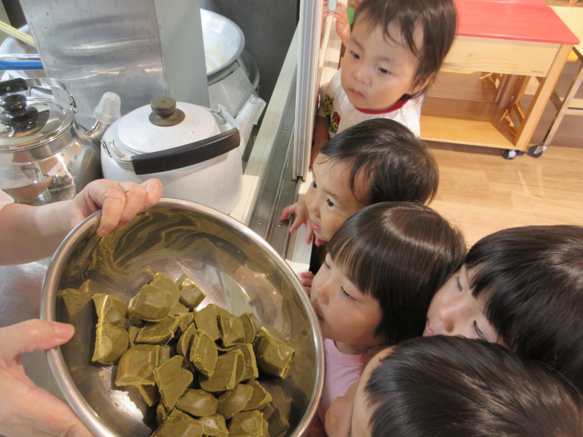 調理室の前に行き、給食を作っている様子を見に行っています。調理前の食材や調理工程を実際に見ることで、給食の時間をより楽しみにしています。