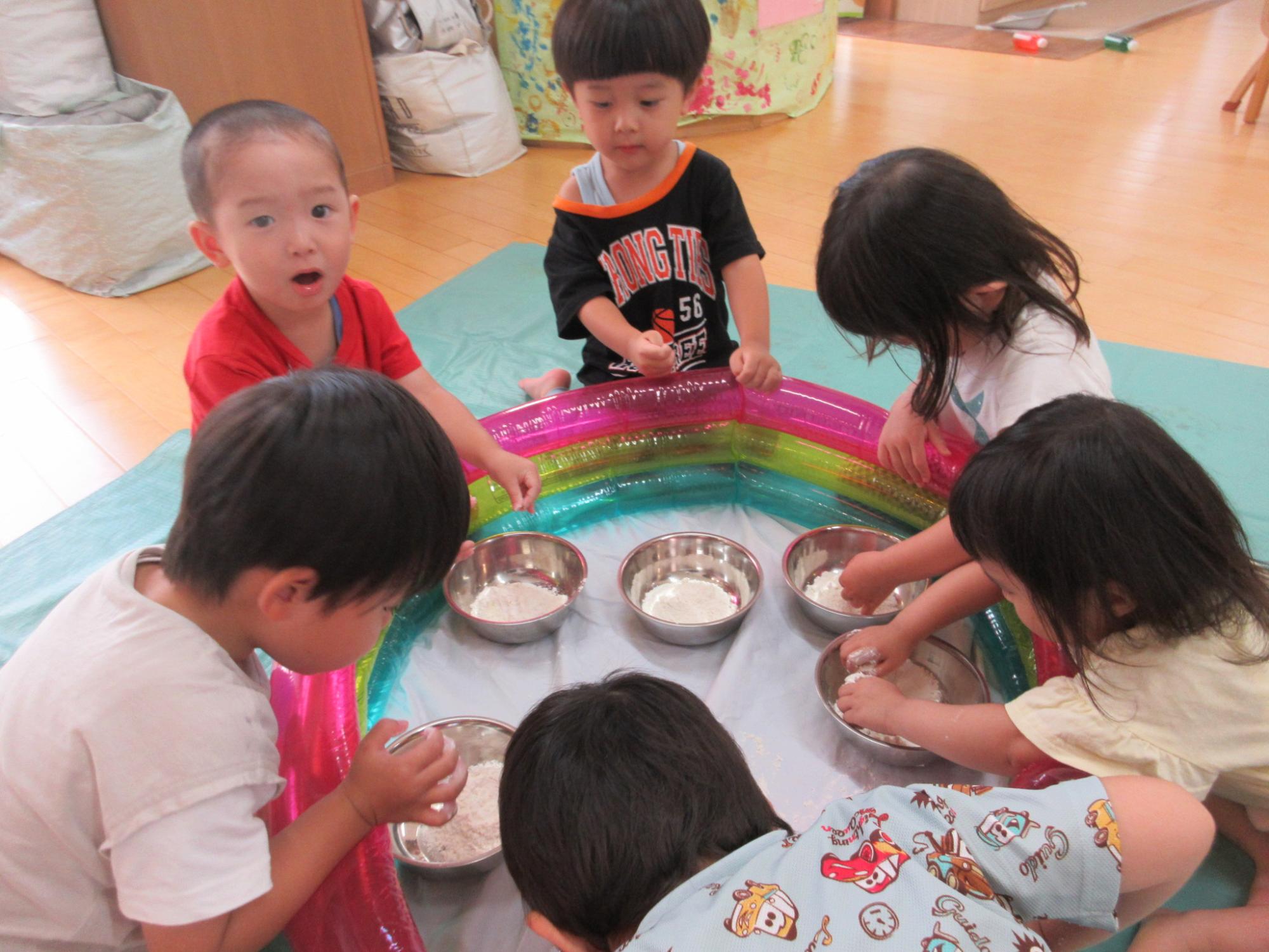小麦粉に触れ、そのままの粉の感触や、水を加えた時の”ドロドロ”や”モチモチ”とした感触を楽しんでいます。それぞれ好みの感触を見つけています。