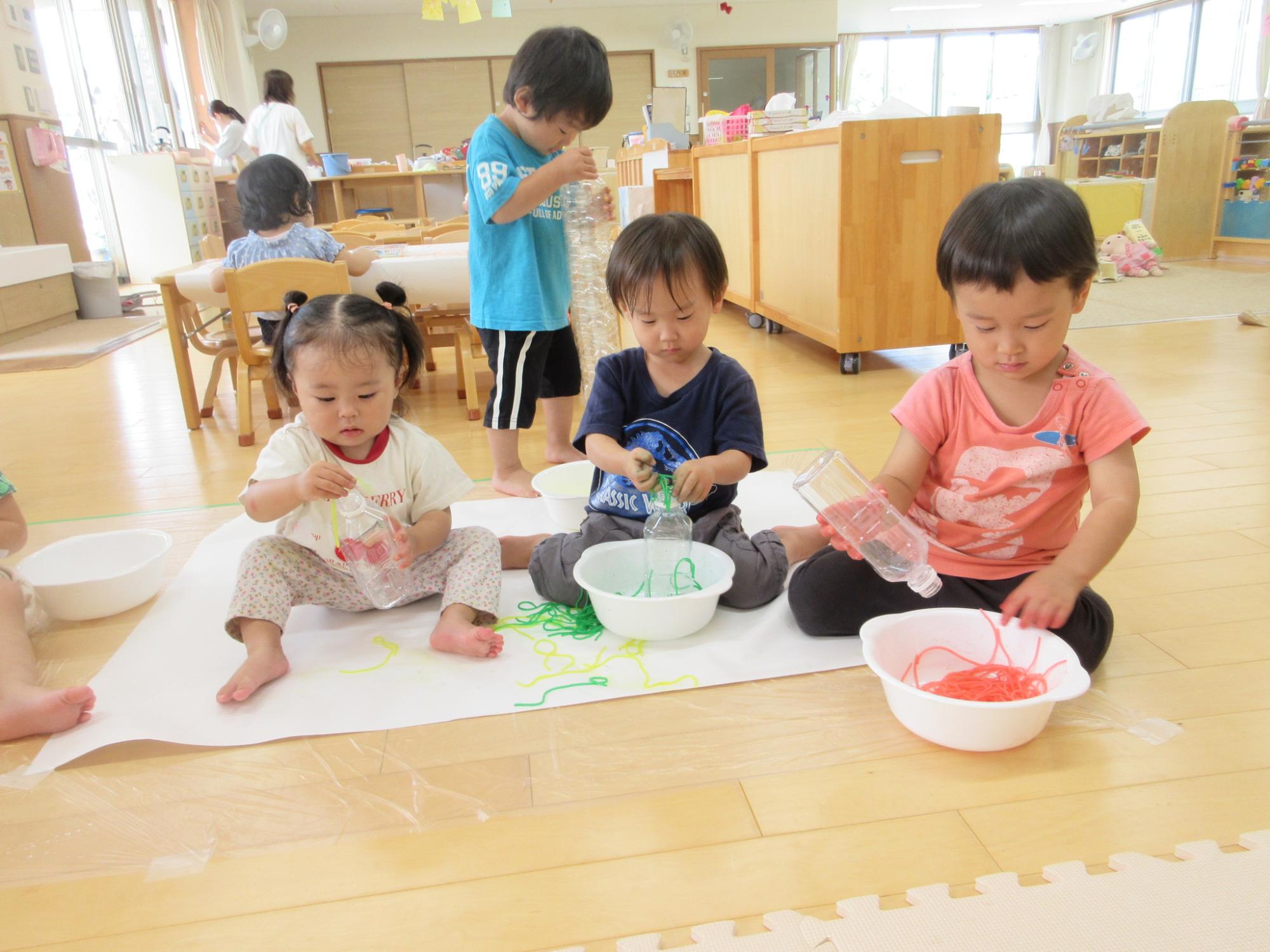 暑い日が続きますが、室内や涼しい場所で水に触れたり、感触遊びなどを通して、五感を存分に使いながら生き生きと遊んでいます。【乳児職員】