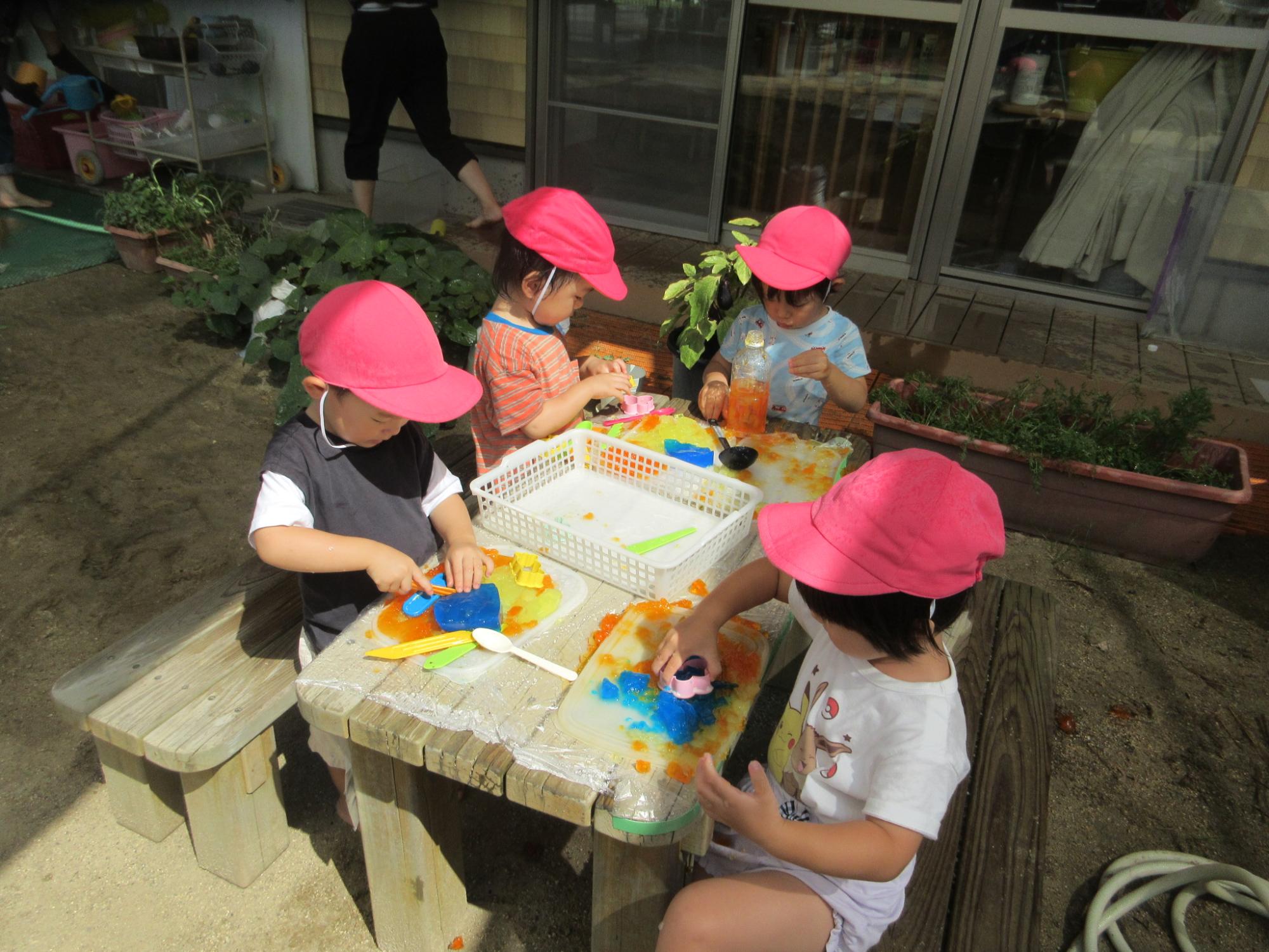 「キラキラしてる」「ゼリーみたい」と寒天を手で握ったり、型抜きをしたり、料理のように切ってみたりして遊んでいます。