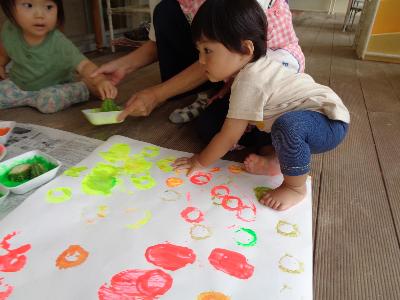 野菜を切る様子を近くで見ていた子どもたちは、断面を見て「種あるで」「いっぱい入ってる」など、気付いて言葉にしていました。スタンプすると野菜の形が出ること、様々な色の絵具を使って遊ぶことを楽しんでいましたよ。