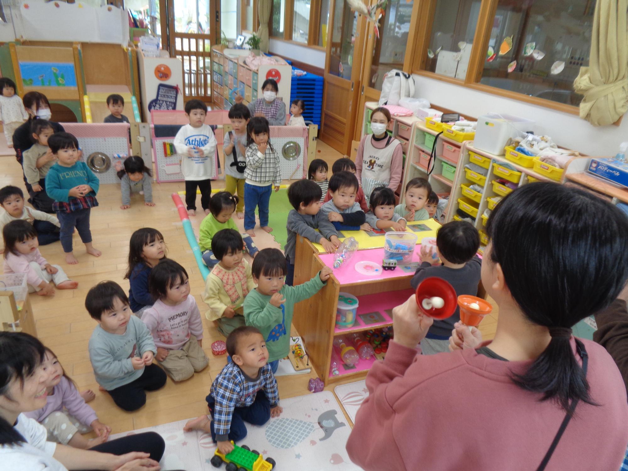 ハンドベルを聴いていた子どもたちが、思いついたように音の鳴る玩具を探しに行き、鳴らし始めました。