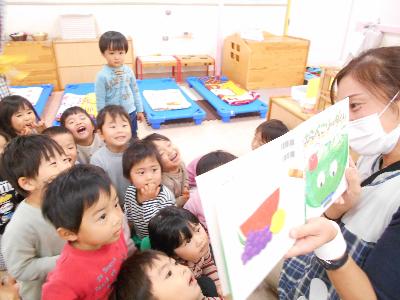 お話が終わると「もう1かいよんで」と子どもたちからリクエストがあり、ユーモアあるお話に大盛り上がりでした。