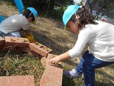 園庭の奥まったところにあるキャンプ場と石研究所を見つけ、幼児組に混じって遊んでいます。興味があるとまず「触れる」ことから始めて、面白さに気づいていきます。子ども達が遊びの中で、何気なくしているように見える行動の一つ一つが、大事な気づきや発見につながっていくのですね。秋の自然は子ども達にとって魅力がいっぱいで、心をときめかせながら日々の戸外遊びをのびのびと楽しんでいます。
