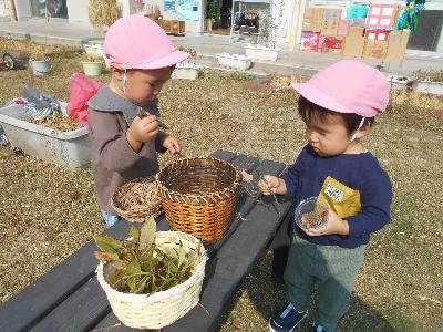 葉っぱや木の実、枝等、自然の中にある素材に触れて遊んでいる子ども達。「見て、触れて、確かめる」ことを楽しんでいます。