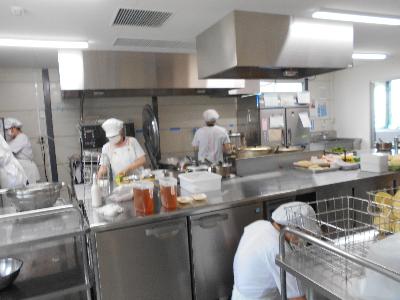 園庭側の窓から調理の様子が見えるので、遊びの途中にのぞく姿も…。