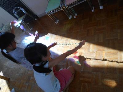 仮園舎での生活がスタートしました。初日は戸惑っていた子どもも、2日目からはすっかりと慣れて、今までのようにやりたい遊びを見つけて思いきり遊んでいます。
