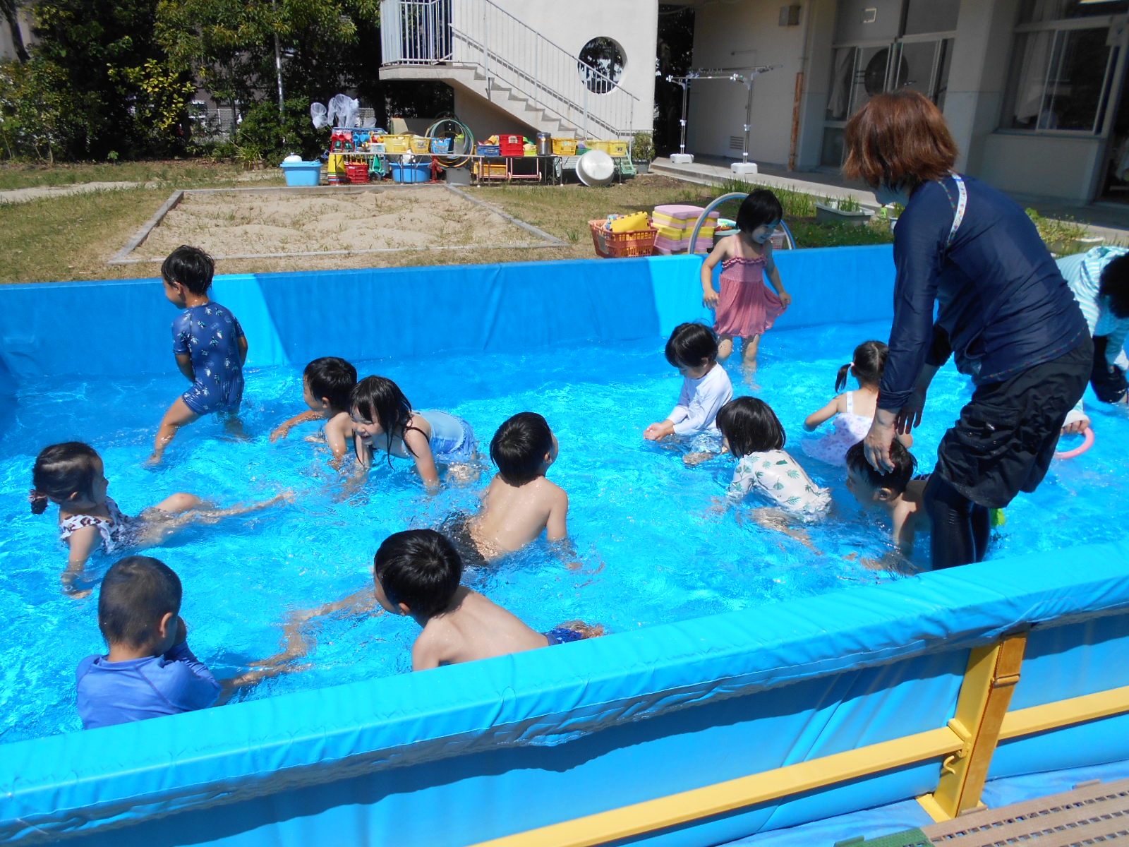 暑い夏の陽ざしの中、楽しみにしていたプール遊びが始まりました。水着の準備ができると園庭のプールに一目散に駆け出す子ども達です。