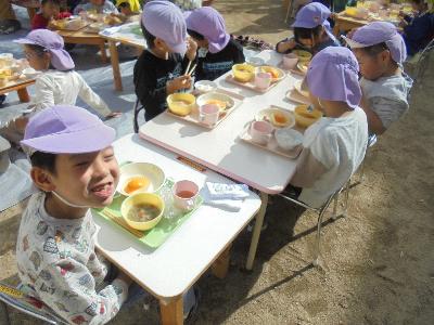 「あつあつだね!」「お芋甘いね~」と近くにいる友達と楽しそうに話をしながら園庭で会食しました。