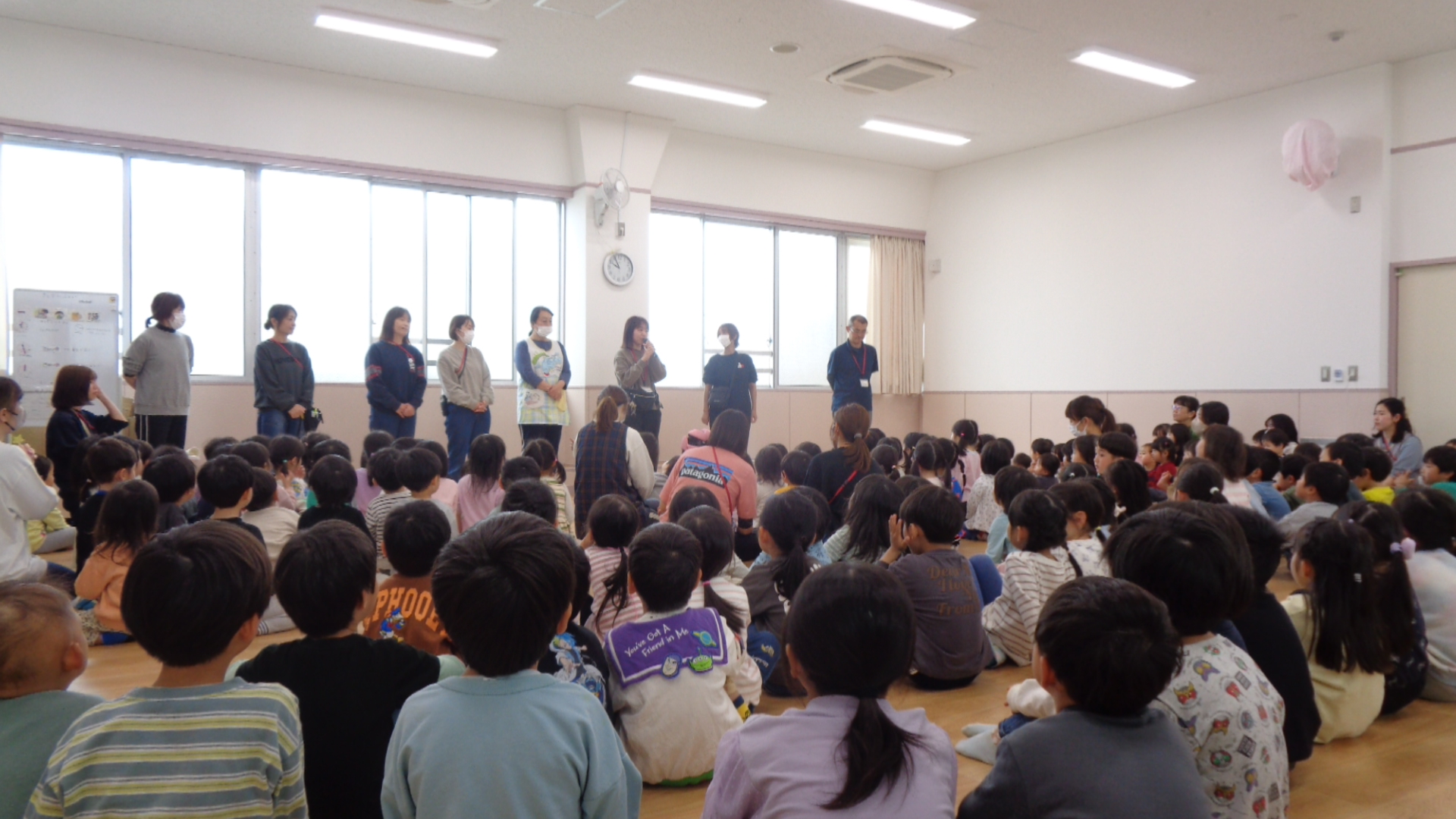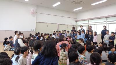 お別れ会。市内の公立就学前施設へ異動する職員からみんなへのメッセージを伝えました。