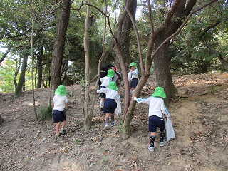 4歳児は山の斜面登り。木をつかんで、よいしょ。