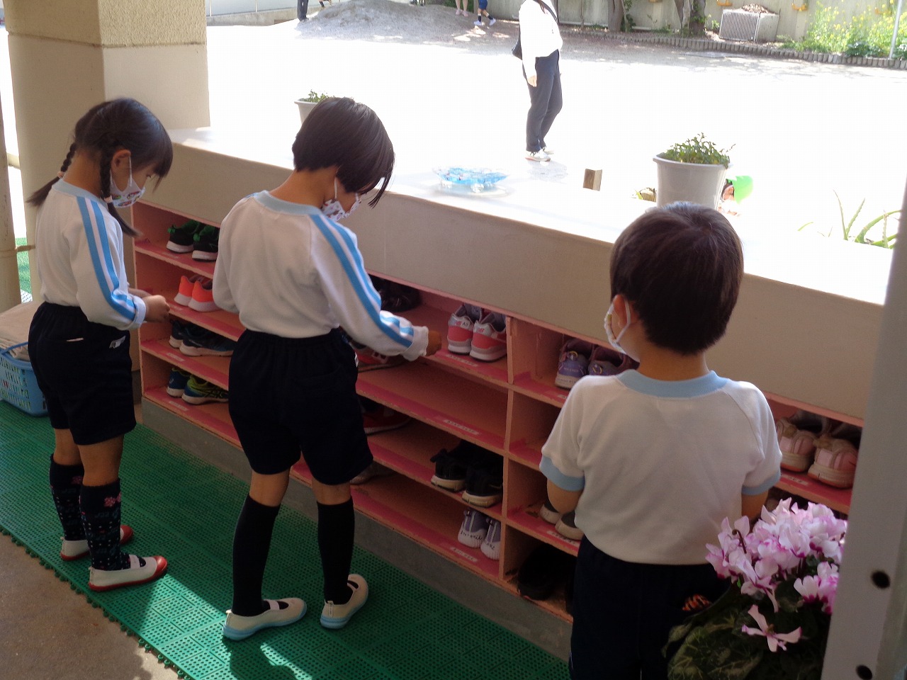 保育室やテラスの自分の場所や物にシールを貼っていきました。覚えたり、意識できたり、友だちの様子にも関心が持てたりする学びがみられました。