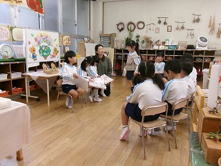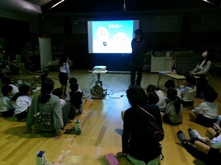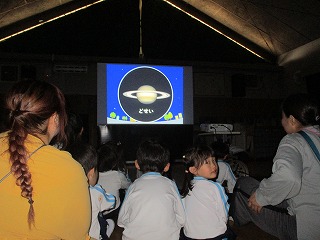 第2部はこども文化科学館からお越しいただき、星のお話をしていただきました。くらくなるのが早くなり、子供たちの生活の中でも星を見ることがあるようで、興味を持って聞いていました。色々なお話の中では、星には色があり赤・青・黄色など色々な色に光っていることに歓声が上がっていました。