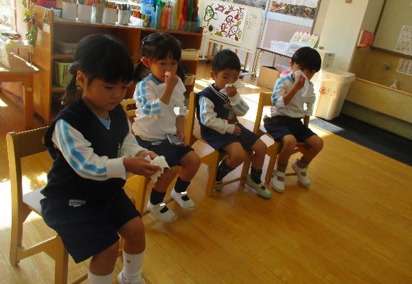 ティッシュを1人1枚持って一緒に鼻を片方ずつゆっくりかむように伝え、やってみました。片方の鼻を押さえたままかむことが難しそうでしたが頑張ってかかもうとしていました。