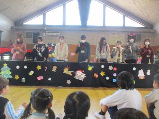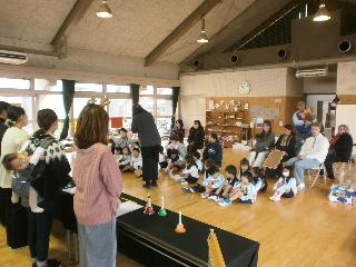 後半は、全園児で保護者(有志)のクリスマスソングのハンドベル等を使った楽器の演奏を聞きました。子供たちは知っている歌を一緒に歌い、笑顔が見られました。何度も練習してくださった保護者の方々、ありがとうございました。