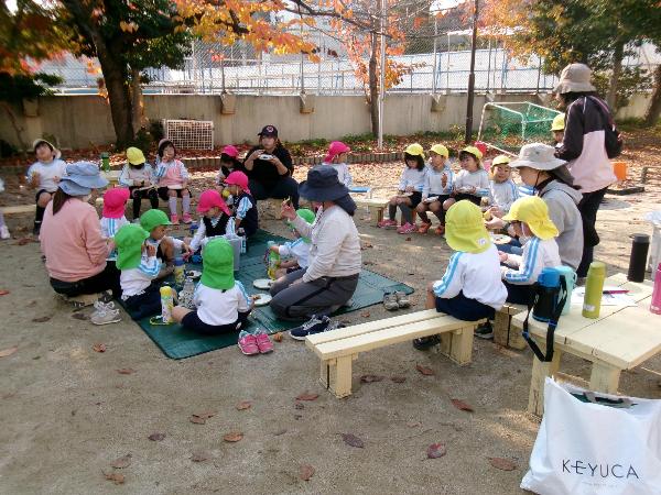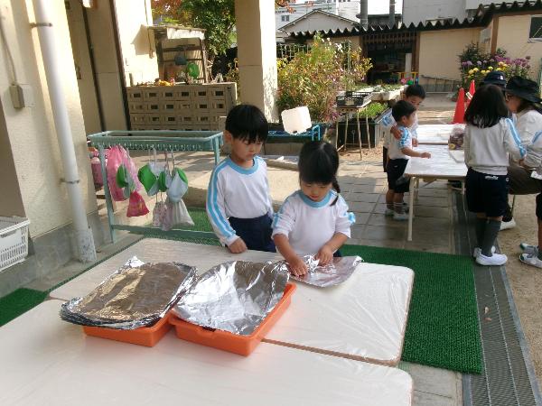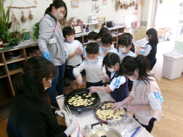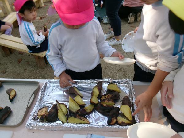 12月2日は焼き芋をしました。子供たちはお芋の準備をしました。5歳児は4歳児と3歳児にサツマイモの洗い方とアルミ箔の巻き方を丁寧に教えていました。。園芸ボランティアの地域の方、保護者の方が朝早くから準備をしてくださり、おいしい焼き芋ができあがりました。たくさんおかわりした子もいておなかいっぱい食べて満足そうでした。