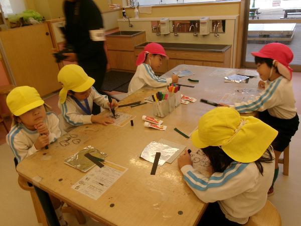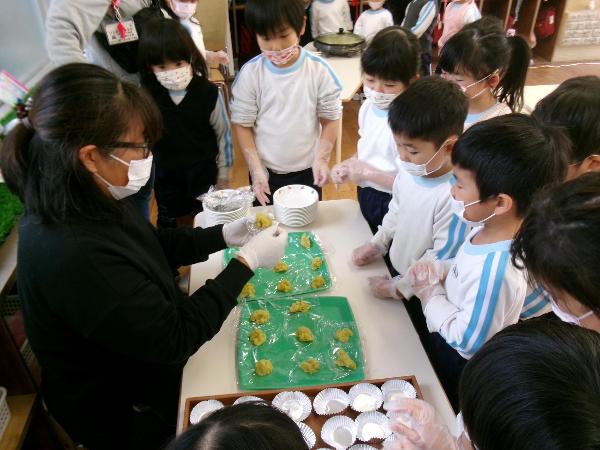 12月22日2回目のいもクッキング。5歳児がスーパーで買い物したアルミカップ、砂糖、油を使って、サツマイモチップとサツマイモきんちゃくを作り3歳児、4歳児にもふるまってくれました。