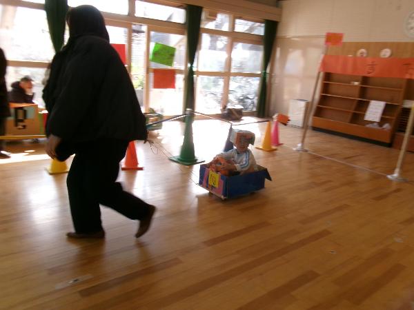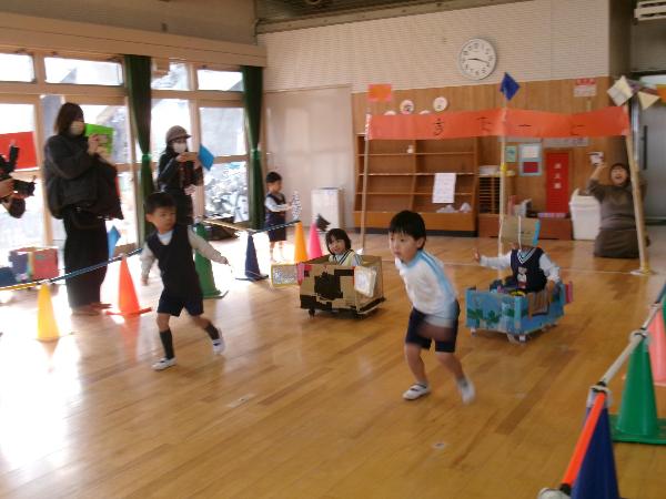 全員で話し合いの結果、迷路チーム、スーパーカーチーム、メリーゴーランドチームの3つのチームができ、活動が始まりました。「遊園地が出来たら、おうちの人に来てもらいたい!」「ママたちに遊んでほしい!」という気持ちがわいてきて、参観日に招待することになりました。思うように作れず、うまくいかないことも多くて、何度も失敗を重ねながらも、『みんなで安全に遊ぶ!』『あきらめない!』を合い言葉に、試行錯誤しながら作ってきました。