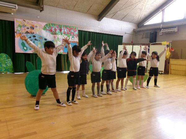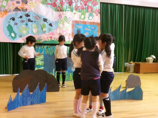 今日は5歳児の参観日でした。緊張しながらもたくさんの保護者の方に見ていただくことをとても楽しみにしていたきりん組の子供たち。10ぴきのかえるごっこが終わるとやり遂げた達成感と満足感いっぱいの表情を見せていました。見終わった保護者の方々から、「楽しんでやっていた。」「しっかりと歌っていた。」「聞こえるように声を出していた。」「昨日から子供は楽しみにしていた。」などの感想を聞かせていただきました。幼稚園生活のまとめとして成長した姿を見ていただくことができたこと、子供たち自身にも大きな自信につながったと思える一日でした。