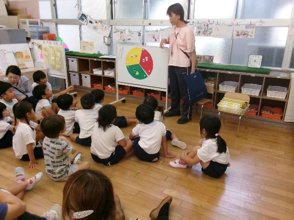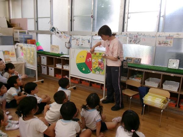 4、5歳児には「赤・黄・緑のグループの食べ物について」話をしました。食べ物には3つのグループに分かれることを伝え、色々な食べ物がどのグループに当てはまるのか考えました。子供たちは考えて言った食べ物が正解のグループに入っていると大喜びしていました。また、その色の食べ物を食べると体のなかでどんな働きをしてくれるのかを伝えました。