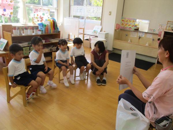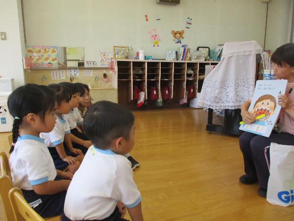 歯の磨き方や歯の大切さについて紙芝居を使って話をしました。紙芝居の後に歯磨きをした後、歯ブラシを洗うことも伝えました。歯磨きのパネルに合わせて一緒に歯磨きをし、「(毎日)歯磨きしてる。」と家での様子を話してくれました。10月からは園で弁当後に歯磨きをしています。乳歯のうちから歯磨きが習慣づくように取り組んでいきます。