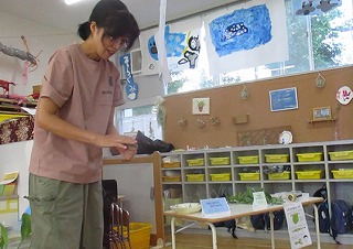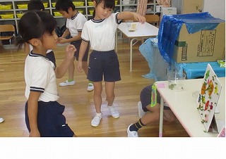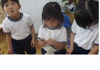 また、シュロの葉でバッタやいろいろな虫を作ったり、オオオナモミの葉で的あてをしたり、くすの木の葉で笛づくりに挑戦したりと、自然物を使って夢中になって楽しんでいました。